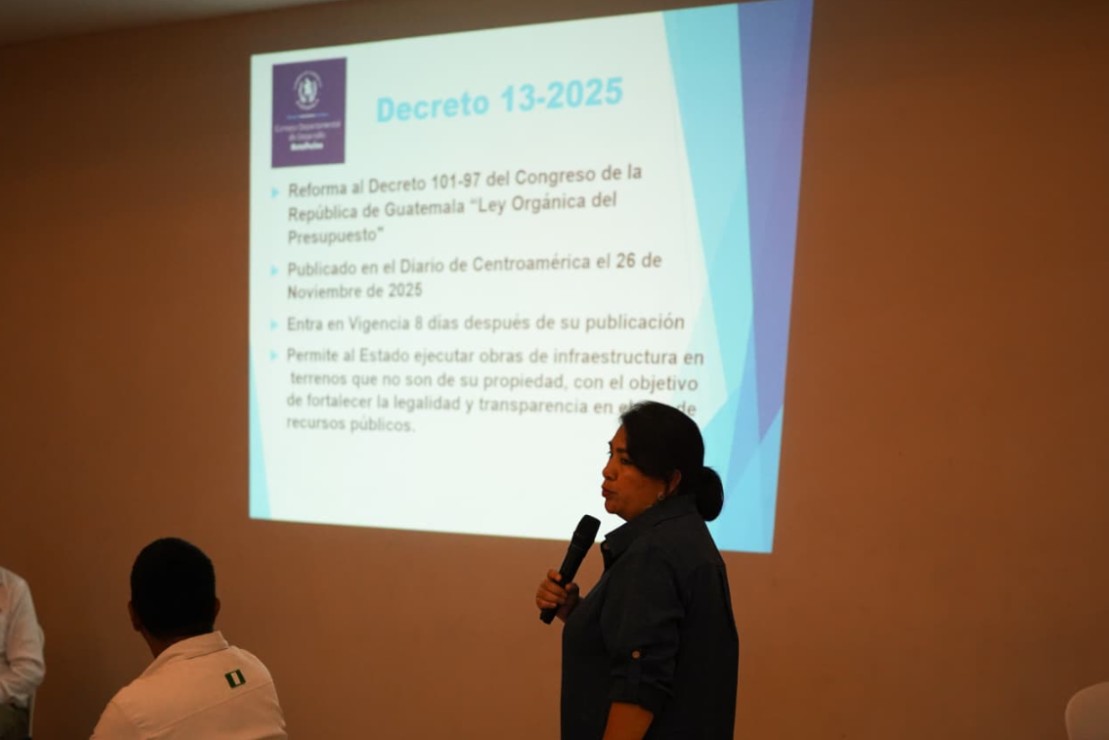 Como parte de la agenda, se expusieron las implicaciones del Decreto 13-2025, referente a la reforma a la Ley Orgánica del Presupuesto, así como los alcances del Decreto Ley 07-2025, relacionados con el fortalecimiento financiero y la continuidad de proyectos del Codede. También se presentó la hoja de ruta para la formulación y ejecución de proyectos ordinarios y extraordinarios 2026, orientada a mejorar los procesos de inversión pública en el territorio.