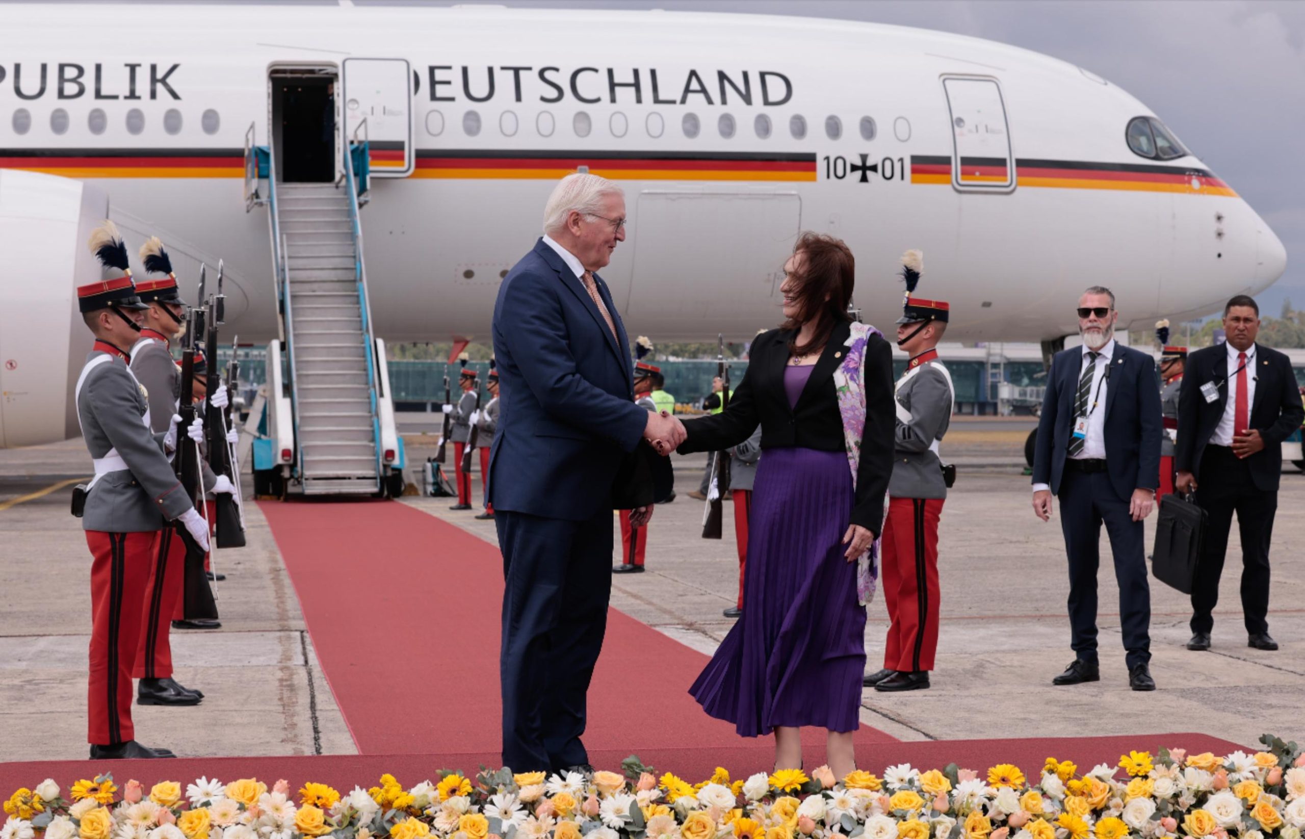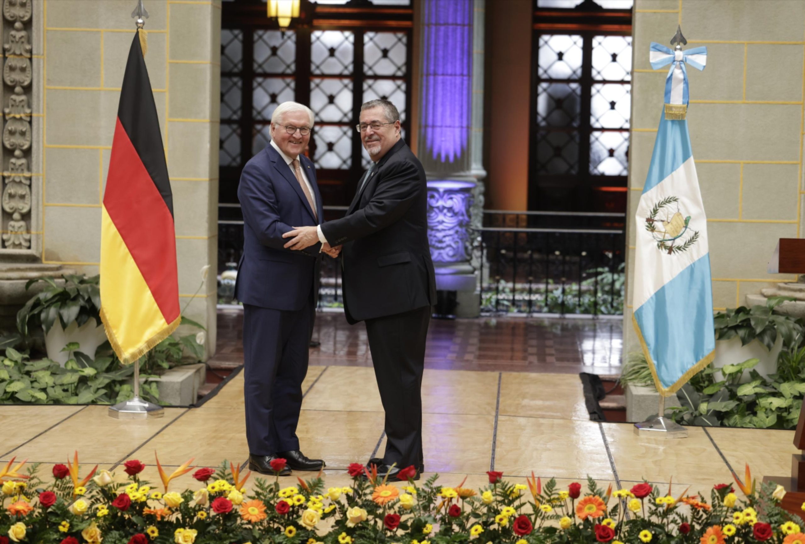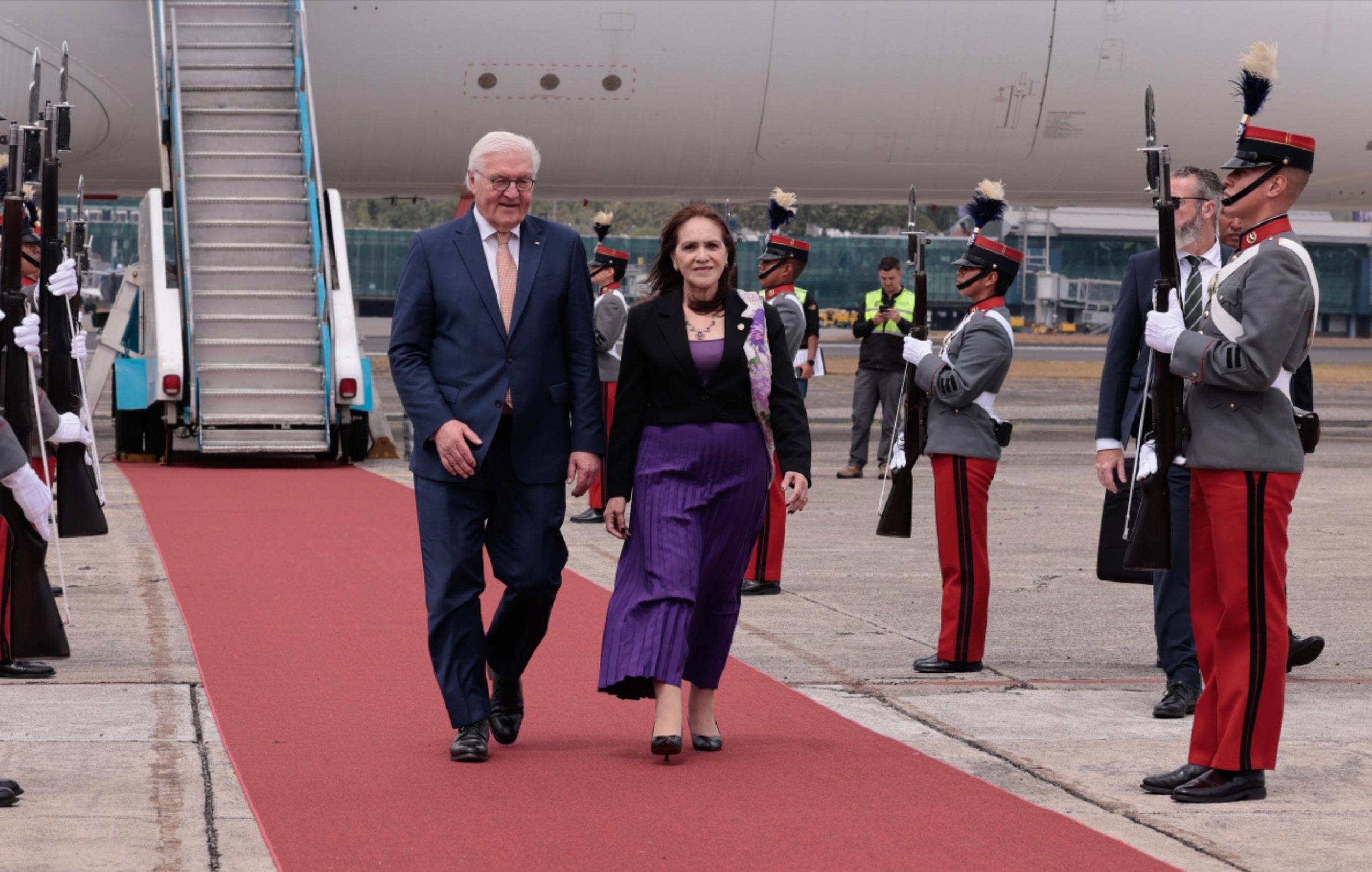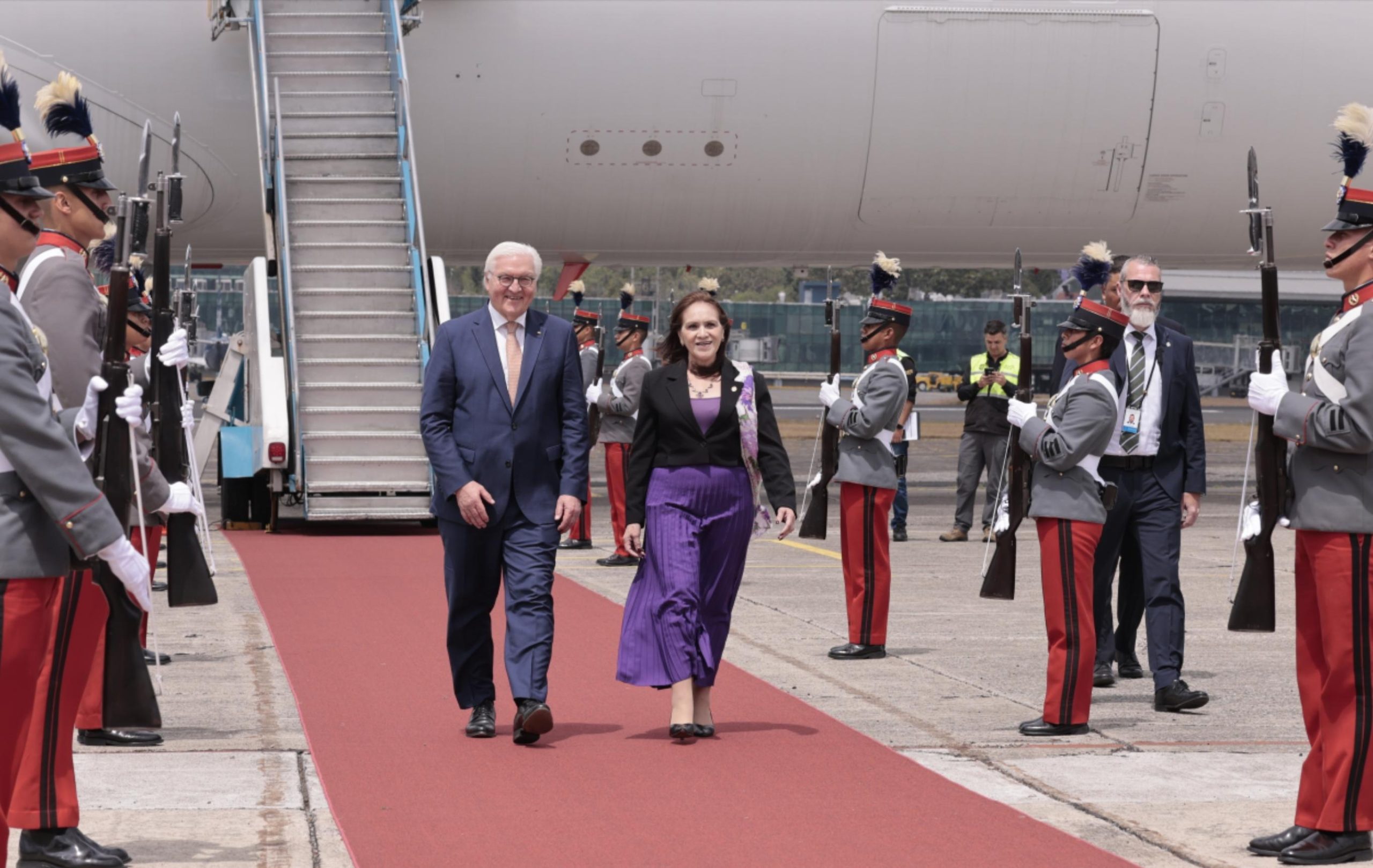 Ciudad de Guatemala, 17 mar (AGN).– Este día, Guatemala recibió la visita oficial del presidente de Alemania, Frank-Walter Steinmeier, quien arribó en horas de la mañana a la Fuerza Aérea Guatemalteca (FAG). Posteriormente, se trasladó al Palacio Nacional de la Cultura, donde fue recibido por el presidente Bernardo Arévalo.
