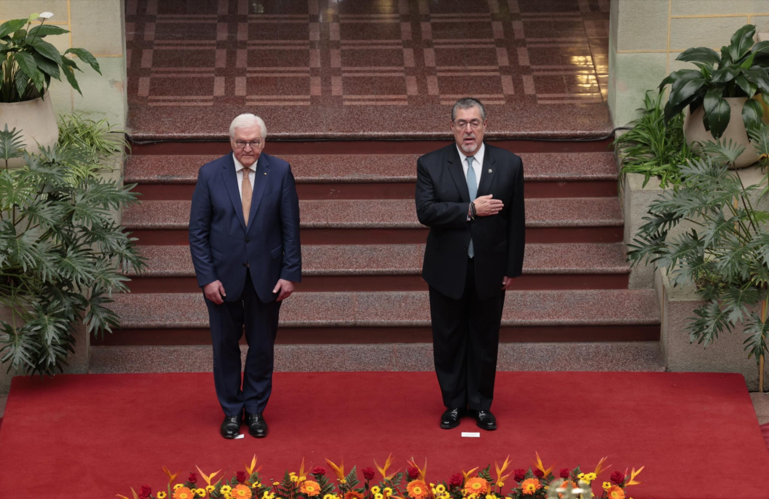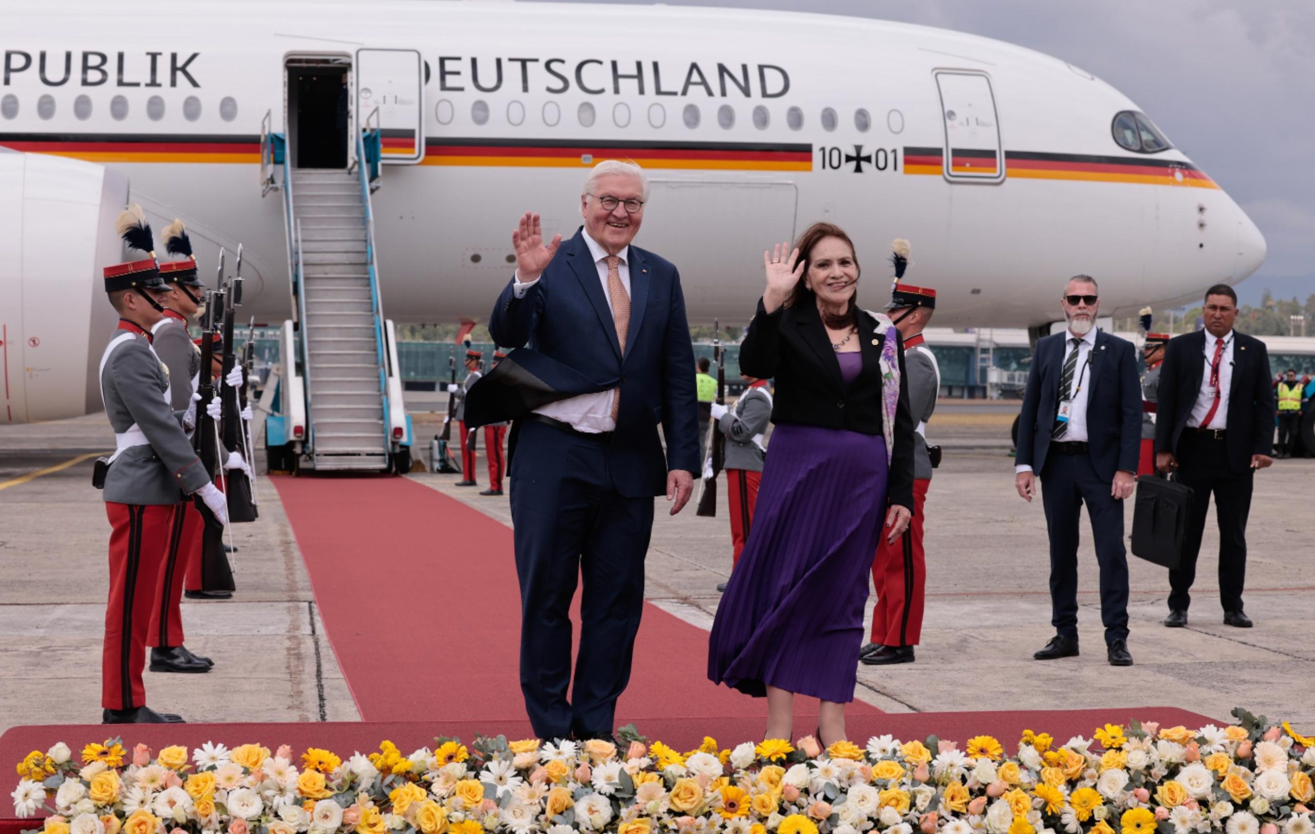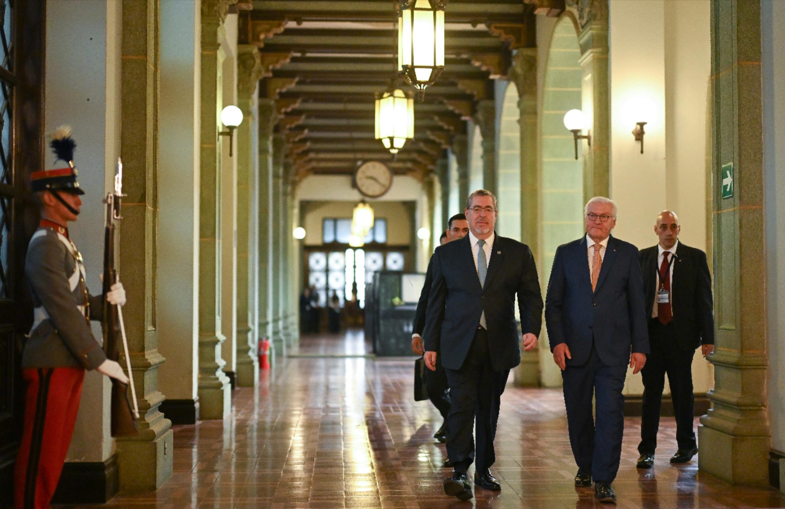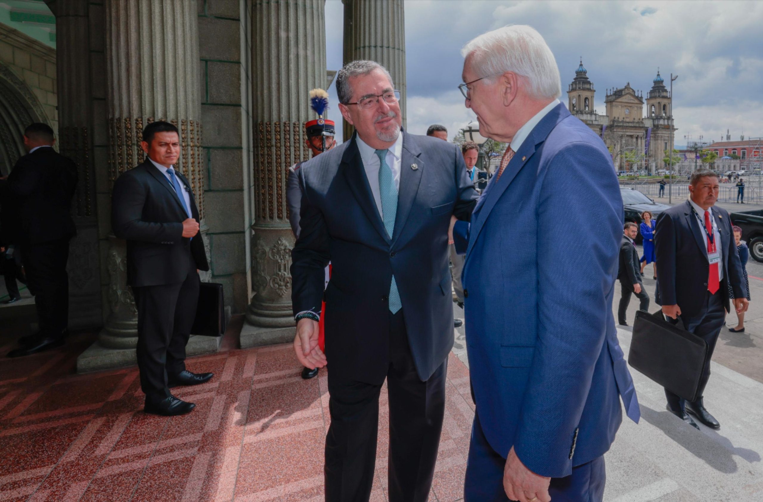 Ciudad de Guatemala, 17 mar (AGN).– Este día, Guatemala recibió la visita oficial del presidente de Alemania, Frank-Walter Steinmeier, quien arribó en horas de la mañana a la Fuerza Aérea Guatemalteca (FAG). Posteriormente, se trasladó al Palacio Nacional de la Cultura, donde fue recibido por el presidente Bernardo Arévalo.