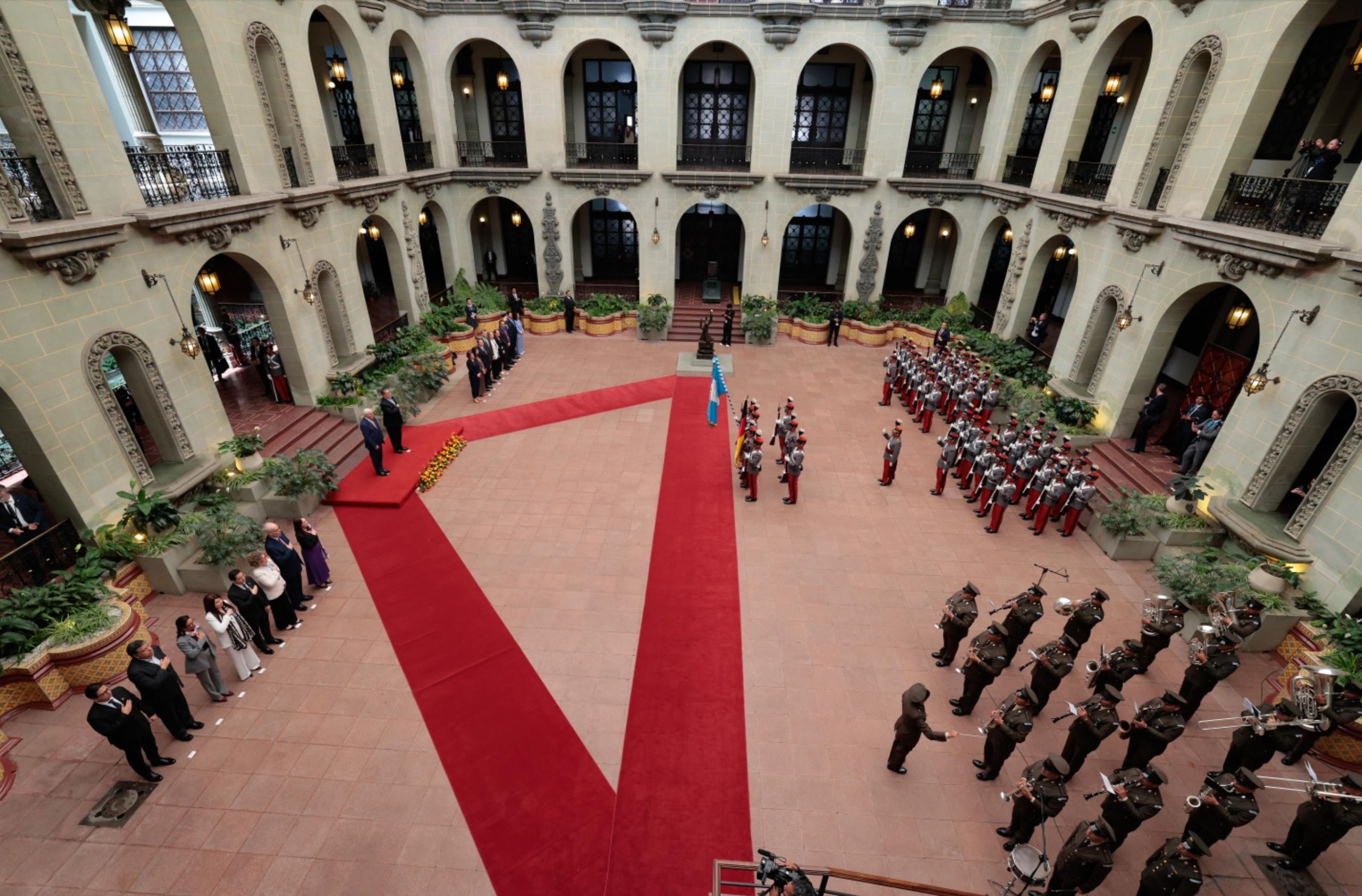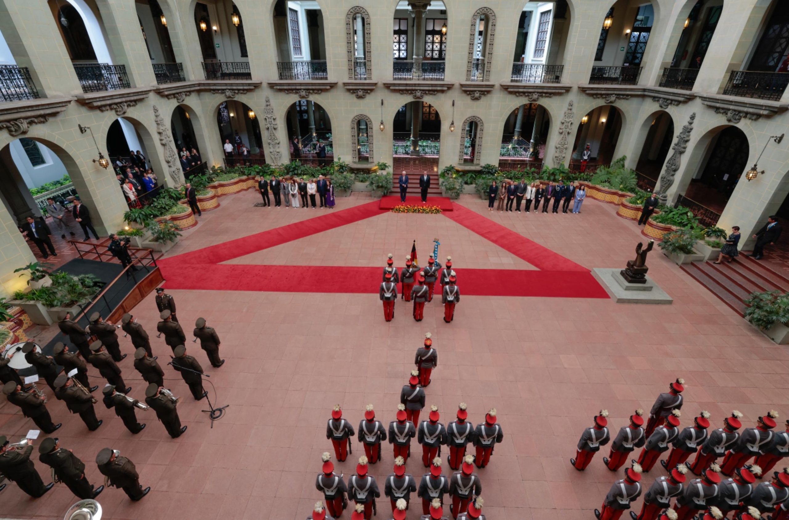 En el Patio de la Paz se desarrollaron los actos protocolarios, donde ambos mandatarios y sus delegaciones entonaron los himnos nacionales. Luego se llevó a cabo el saludo oficial y la presentación de los integrantes de ambas comitivas.