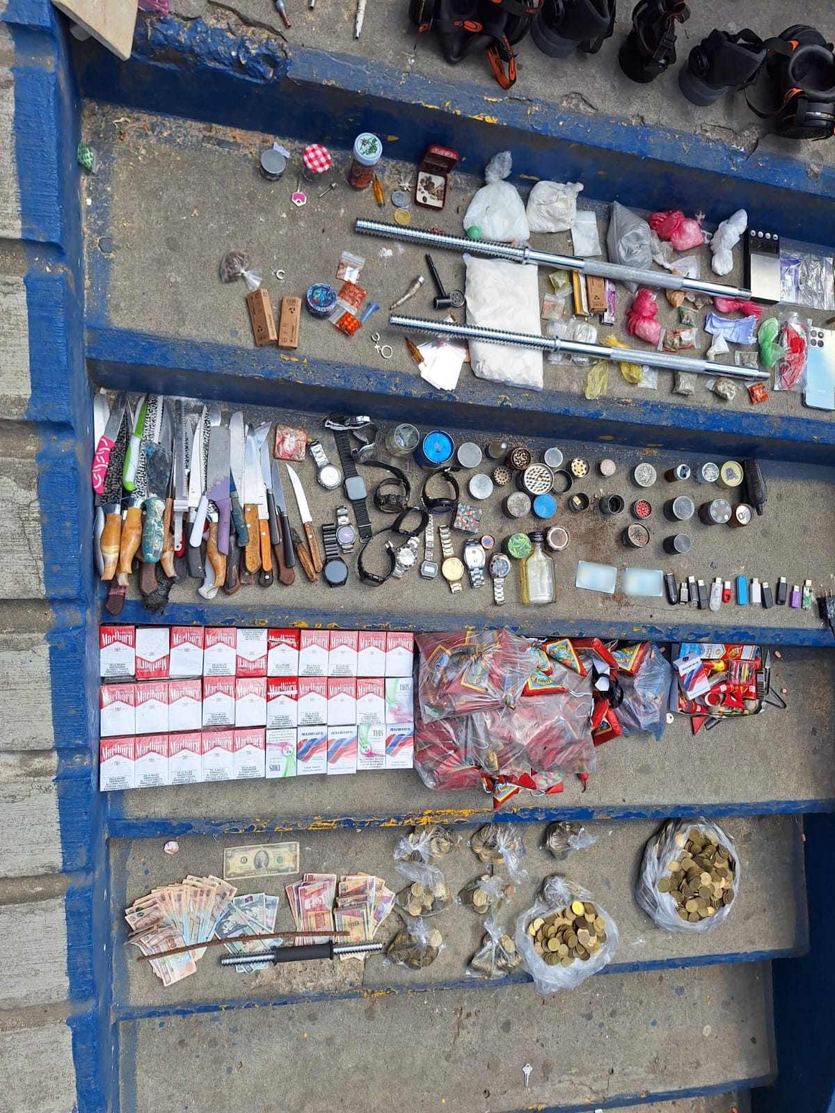 También se localizaron 10 cargadores de teléfono, un radio, 13 relojes y 13 memorias USB, además de 258 cajas de cigarrillos y 33 objetos punzocortantes.