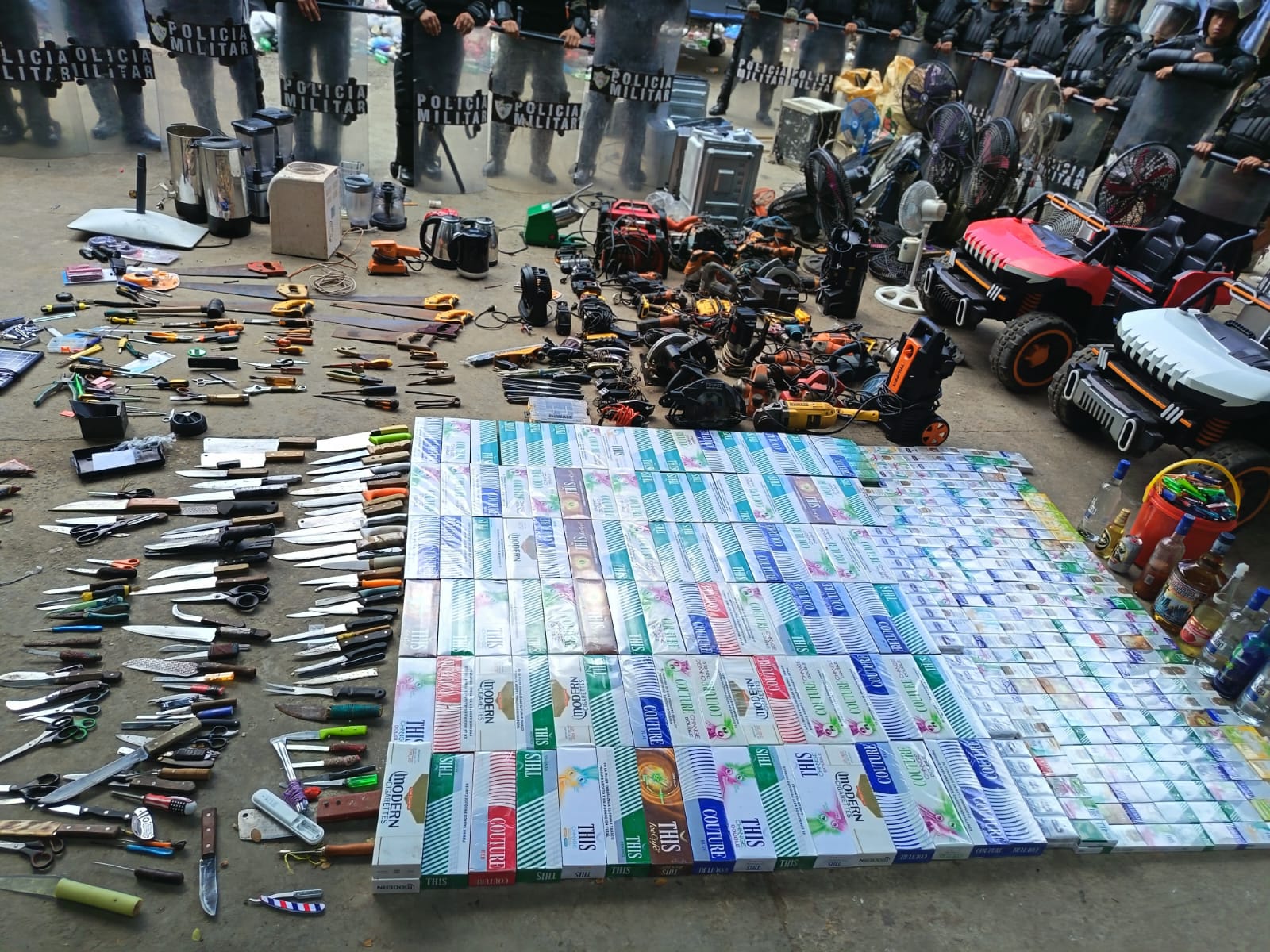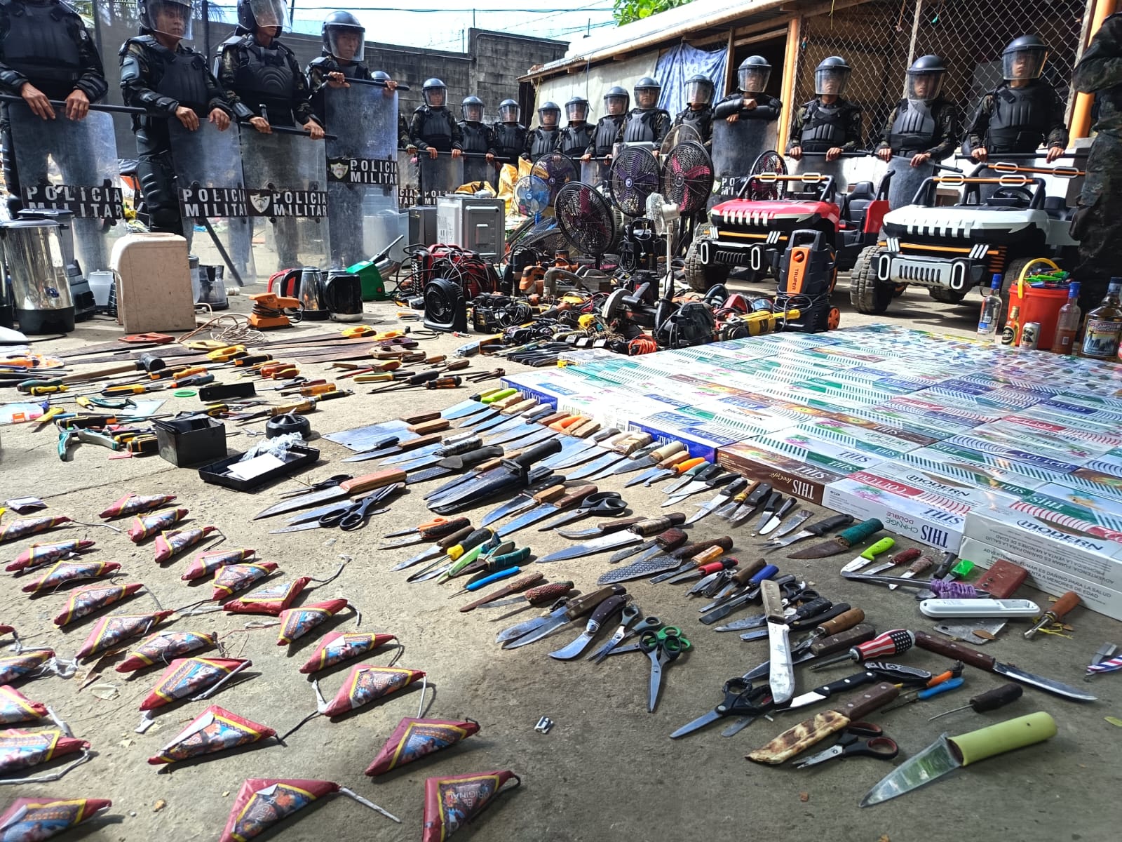 Durante el operativo también se incautaron 100 objetos punzocortantes, 40 cadenas, 1,500 encendedores, además de licor clandestino almacenado en cuatro cubetas, 12 botellas y ocho toneles.