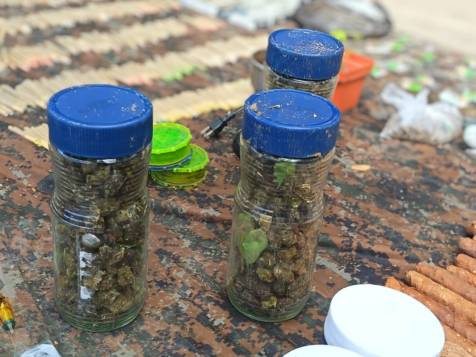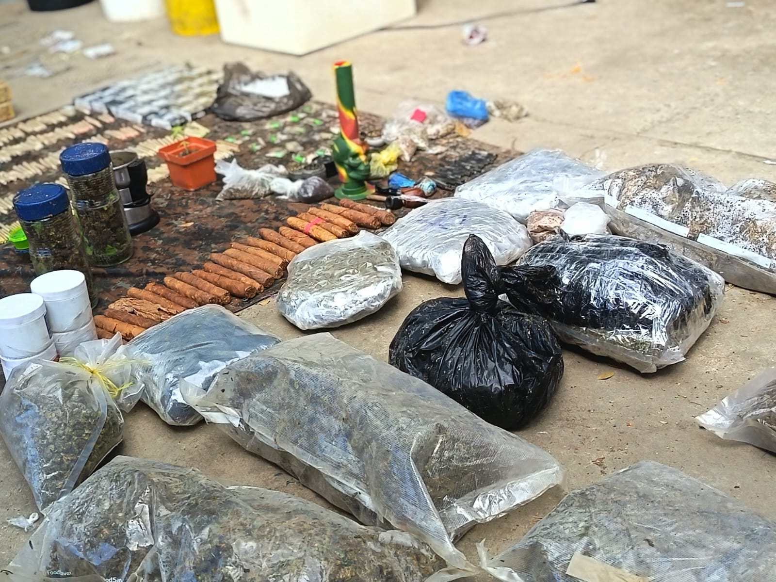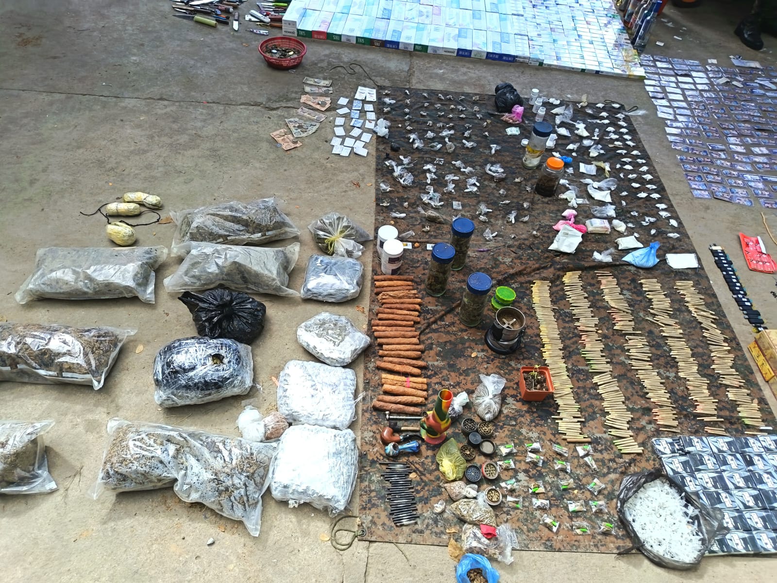 Según el reporte oficial, se decomisaron 126 paquetes de marihuana, 30 cajetillas de cigarros de marihuana, 600 puros de la misma sustancia, así como 92 paquetes de cocaína y mil recipientes tipo colmillo utilizados para almacenar este narcótico.